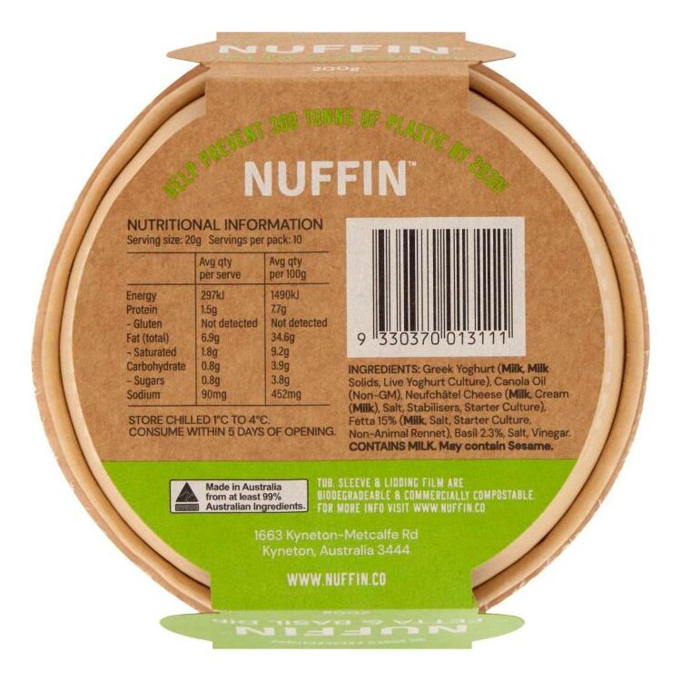 Greek Yoghurt (Milk, Milk Solids, Live Yoghurt Culture), Canola Oil (Non-GM), Neufchâtel Cheese (Milk, Cream (Milk), Salt, Stabilisers, Starter Culture), Fetta 15% (Milk, Salt, Starter Culture, Non-Animal Rennet), Basil 2.3%, Salt, Vinegar